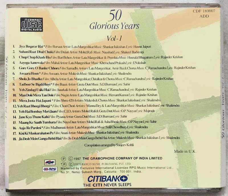 50 Glorious Year Vol 1 Hindi Film Songs Audio CD