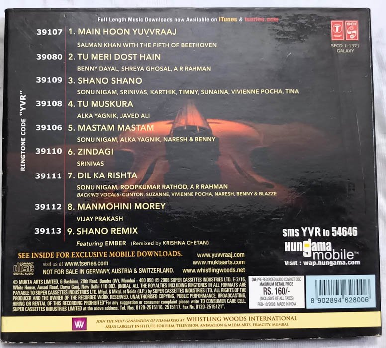 Yuvvaraaj Hindi Audio cd By A R Rahman