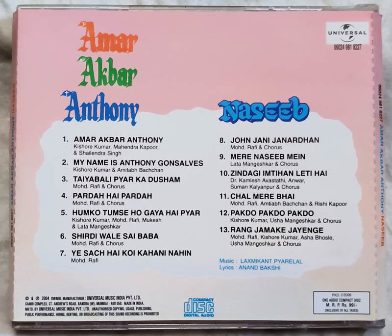 Amar Akbar Anthony-Naseeb Hindi Audio Cd By Laxmikant Pyarelal
