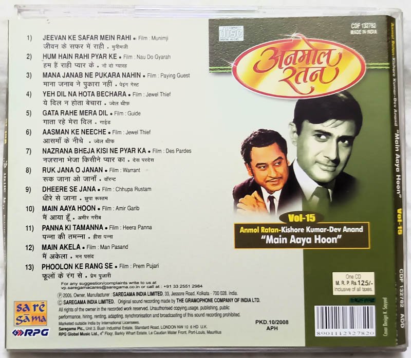 Anmol Ratan-Kishore Kumar-Dev Anand Main Aaya Hoon Vol-15 Hindi Audio Cd