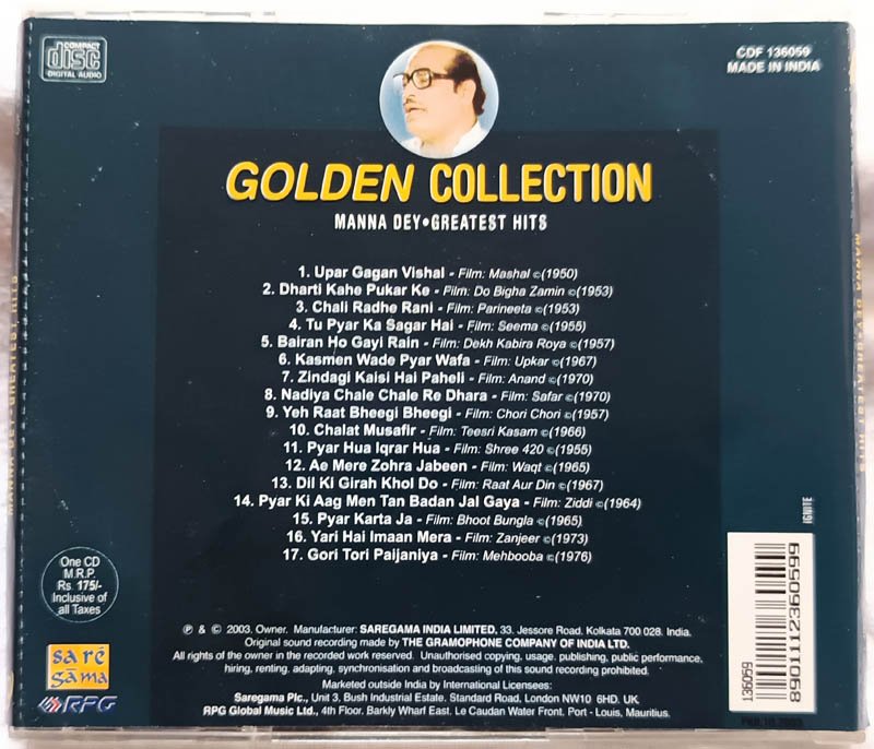 Golden Collection Manna Dey Greatest Hits Hindi Audio CD