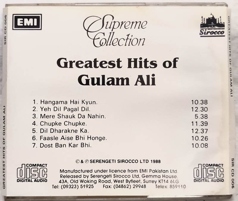 Greatest Hits of Gulam Ali Hindi Audio Cd