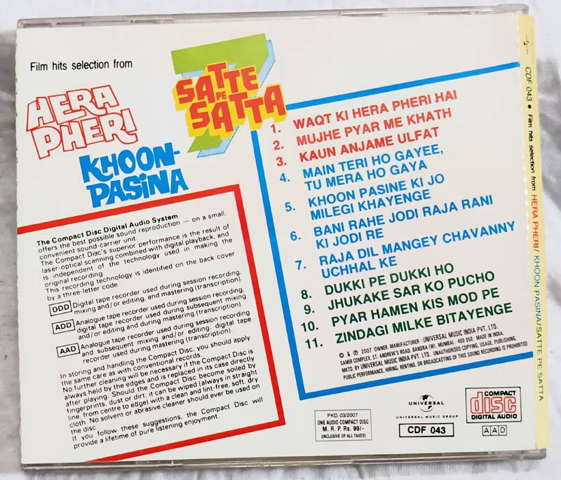 Hera Pheri – Khoon Pasina – Satte Pe Satta Hindi Audio cd