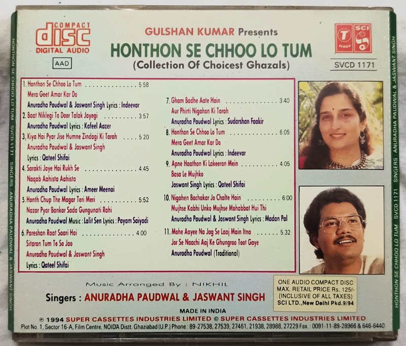 Honthon Se Chhoo Lo Tum Ghazal Hits Hindi Audio Cd By Anuradha Paudwal-Jaswant Singh