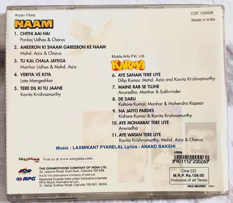 Naam – Karma Hindi Audio cd By Laxmikant Pyarelal