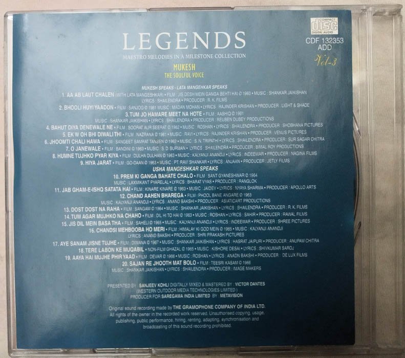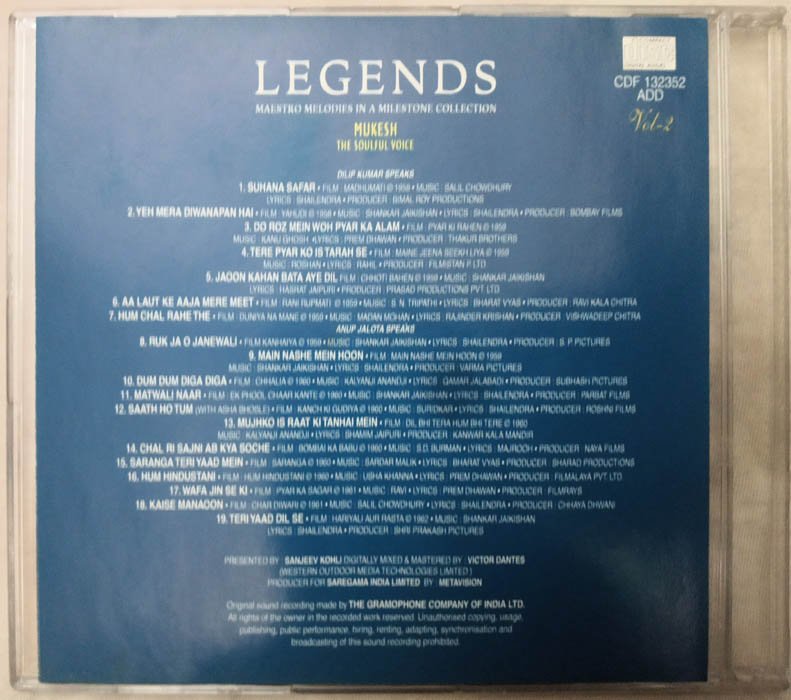 Legends Maestro Melodies in a milestone collection Mukesh The Soulful Voice Vol 1 to 5 Hindi Film Song Audio cd
