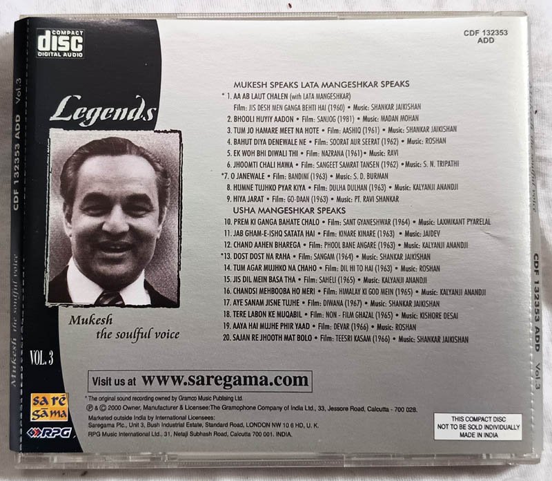 Legends Mukesh The Souful Voice Vol.3 Hindi Audio Cd