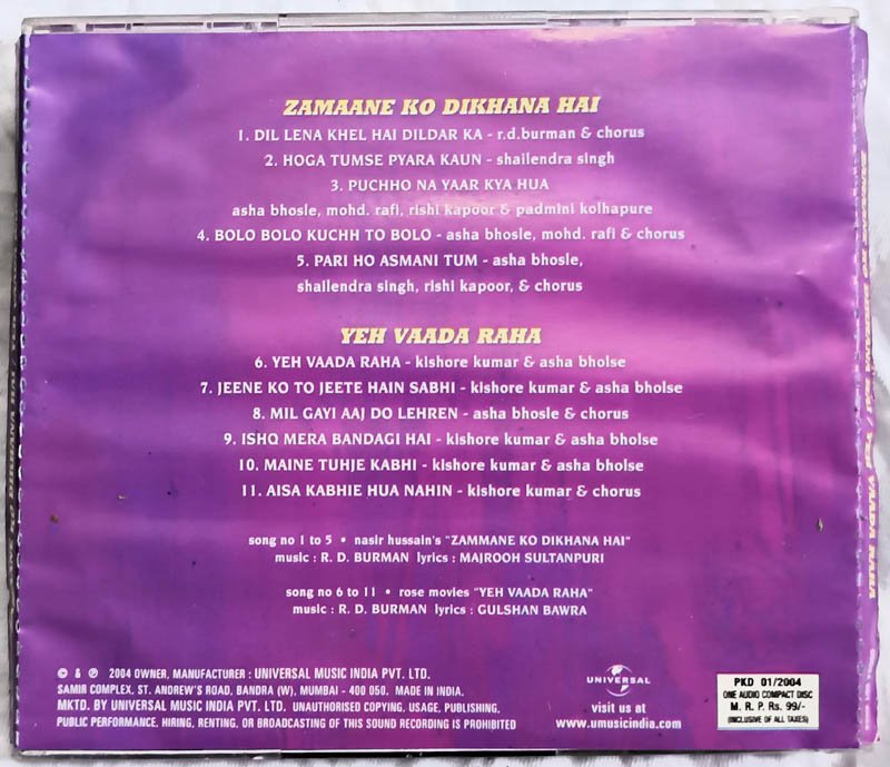Zamaane Ko Dikhana Hai – Yeh Vaada Raha Hindi Audio cd By R D Burman