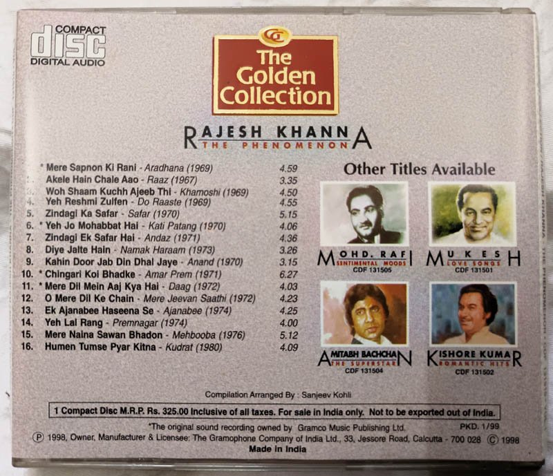 The Golden Collection Rajesh Khanna The Phenomenon Hindi Film Songs Audio CD