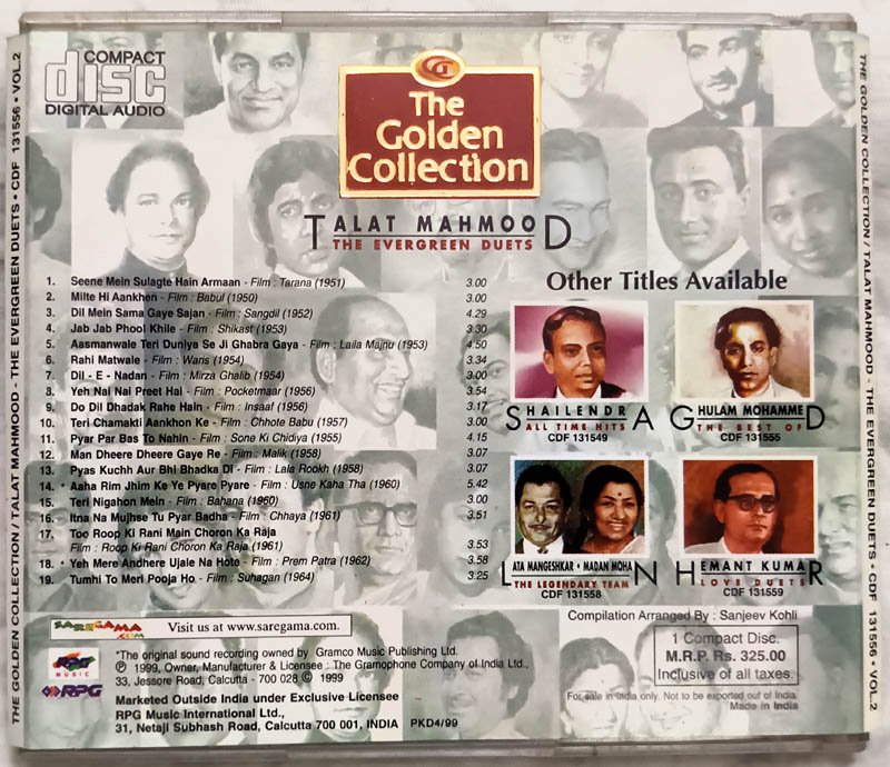 The Golden Collection Talat Mohmood The Evergren Duets Hindi Film Songs Audio CD