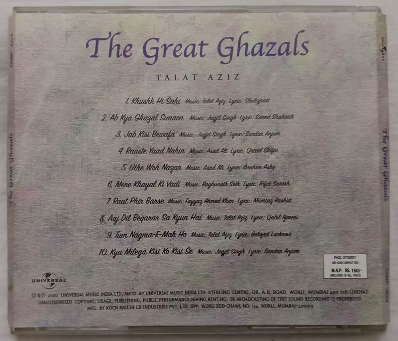 The Great Ghazals Talat Aziz Hindi Audio cd