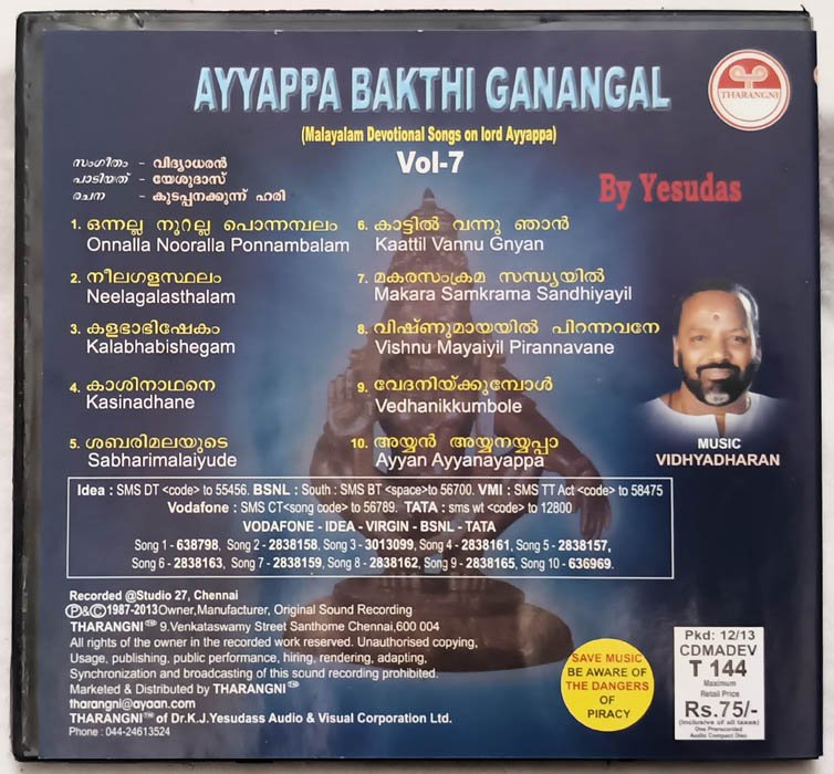 Ayyappa Bakthi Ganangal Vol 7 Malayalam Audio cd By Yesudas