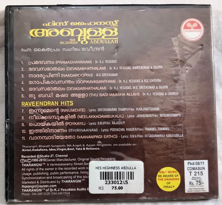 His Highness Abdullah Malayalam Film Audio cd