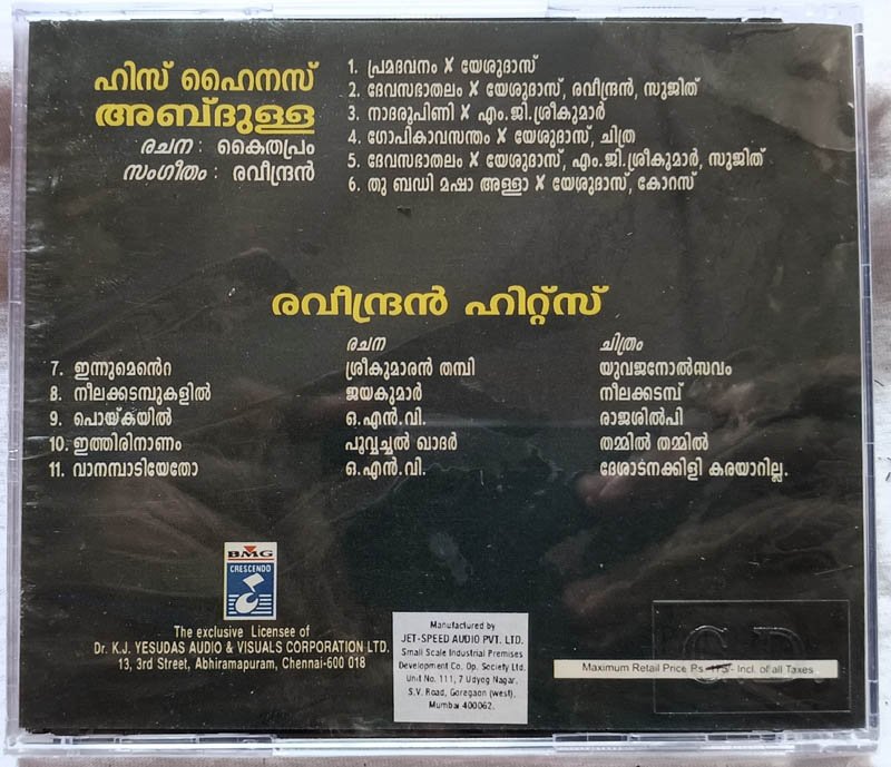 His Highness Abdullah Malayalam Film Hits Audio cd (Sealed)