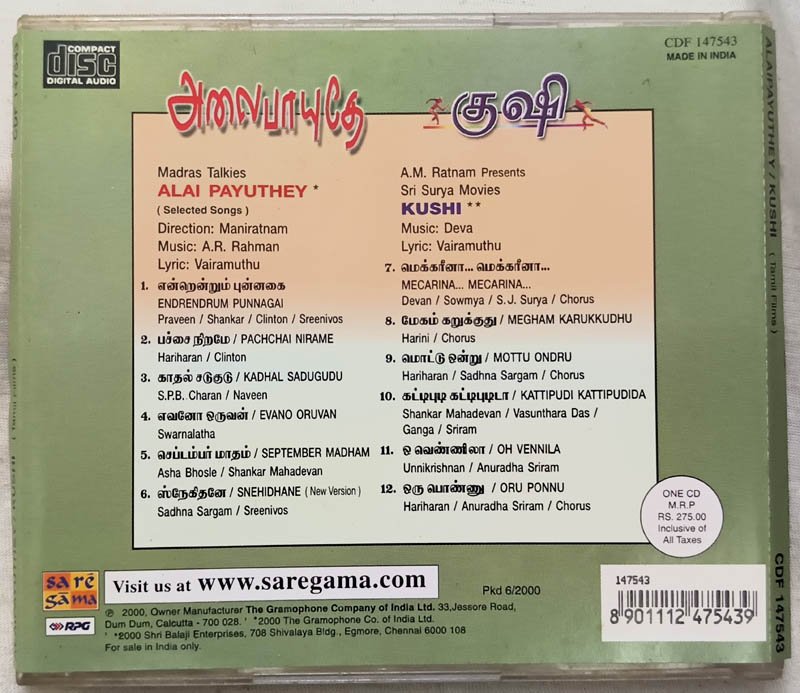 Alaipayuthey – Kushi Tamil Audio CD