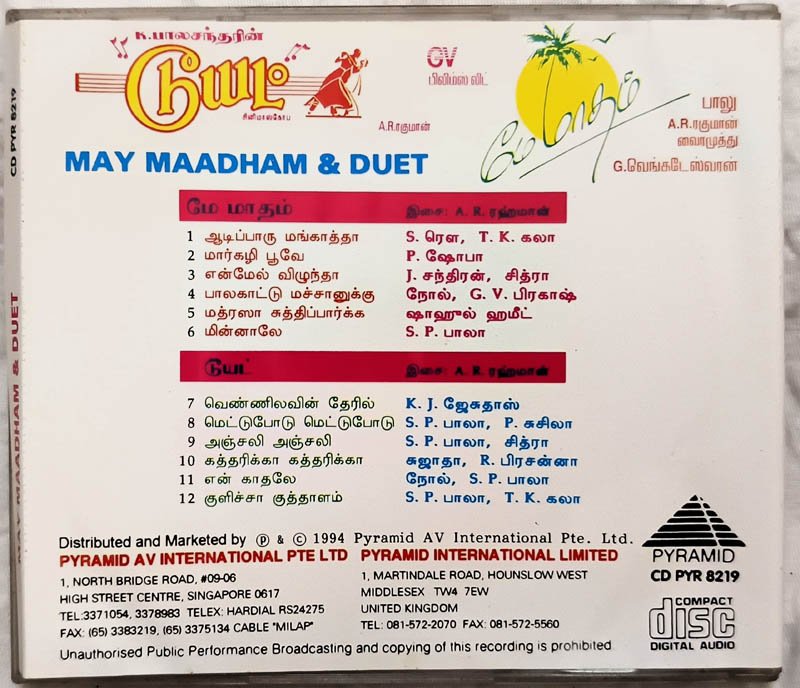 May Madham – Duet Tamil Audio cd A R Rahman