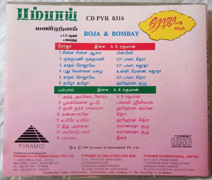 Roja – Bombay Tamil Audio Cd By A.R. Rahman