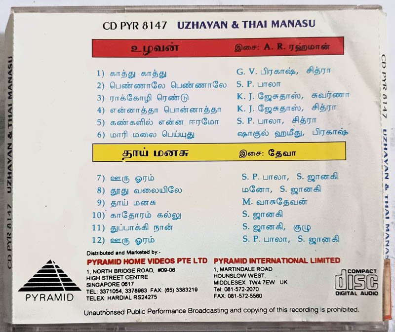 Uzhavan Tamil Audio CD By A.R. Rahman