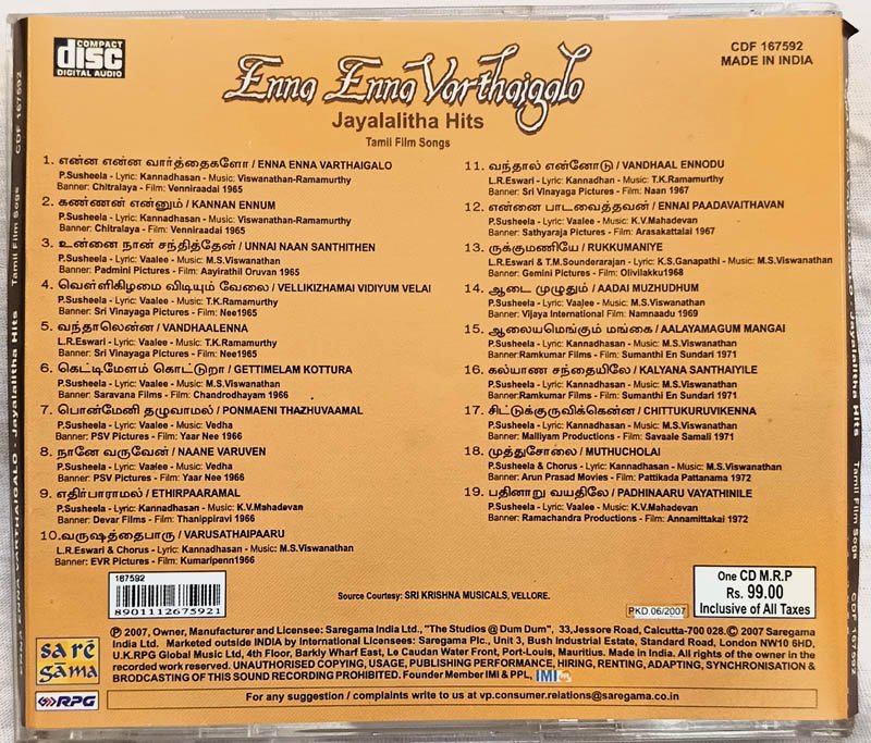 Enna Enna Varthaigala Jayalalitha Hits Tamil Film Songs Audio cd