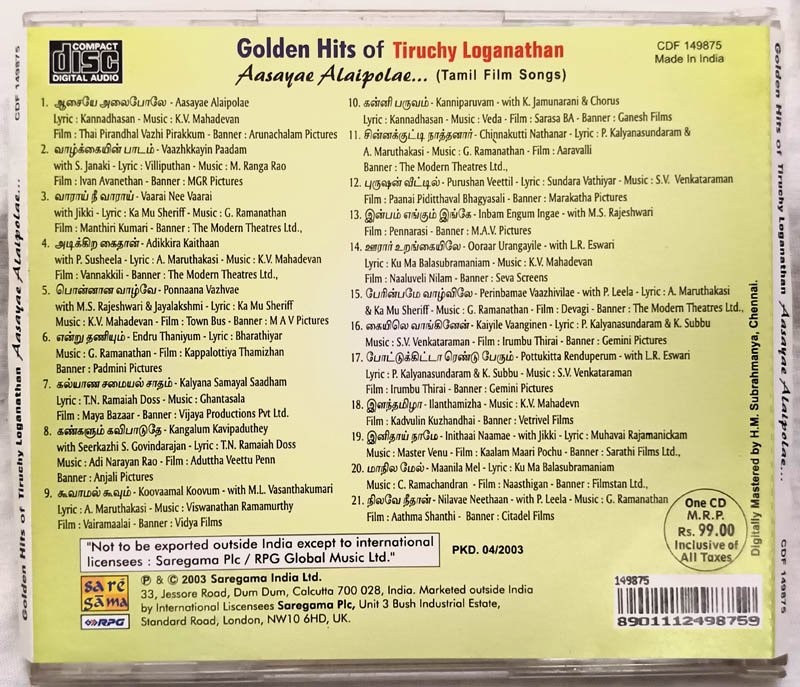 Golden Hits Trichy Loganathanin Asaiye Alaipole Audio cd