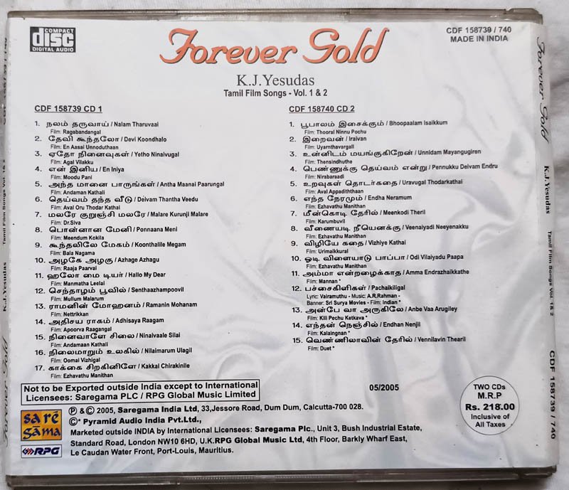 Forever gold K.J. Yesudas Tamil Audio Cd