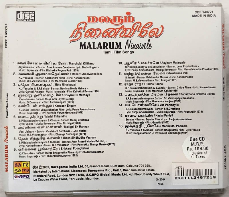 Malarum Ninaivile Tamil Film Songs Audio Cd