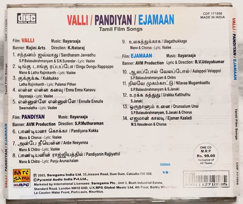 Valli-Pandiyan-Ejamaan Tamil Film Songs Audio Cd