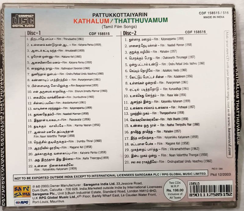 Pattukkottaiyarin Kathalum Thatthuvamum Tamil Audio cd