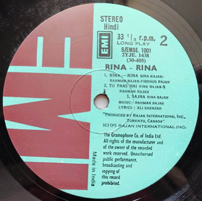 Rina Rina Hindi LP Vinyl Record By Rahman Rajan
