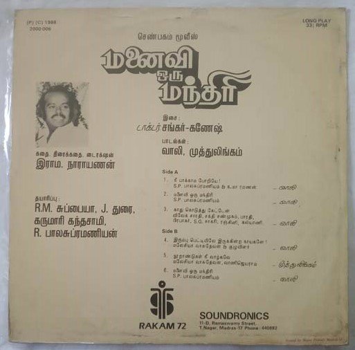 Manaivi Oru Manthiri Tamil LP Vinyl Record By Shankar Ganesh